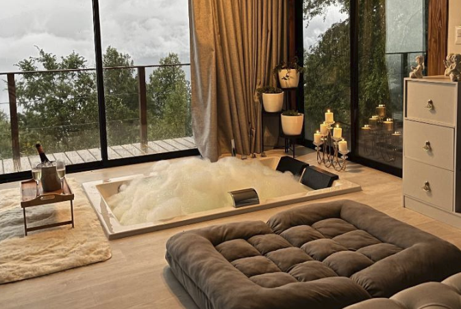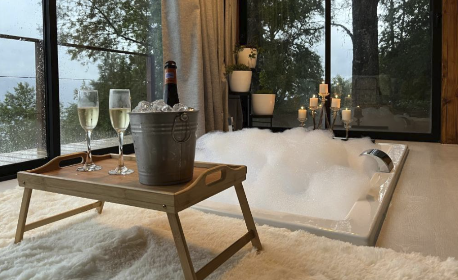 Ubicada en la cima de un cerro, esta cabaña ofrece un entorno único para desconectar del ruido y conectar con el silencio del bosque. Desde su terraza podrás contemplar atardeceres inolvidables y noches estrelladas, lejos de la ciudad. En invierno, nada como disfrutar de la caída de la nieve desde el jacuzzi privado, con una copa en la mano y rodeado de un paisaje de ensueño.